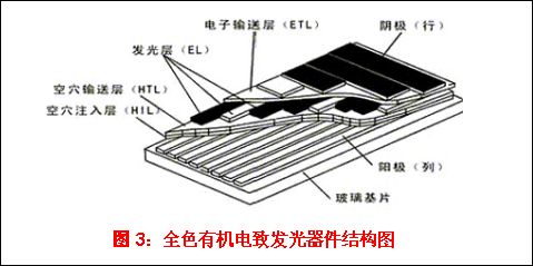 小型单色有机电致发光器件基本上都是三层结构。全色OLED显示器为多层结构,一般超过三层。